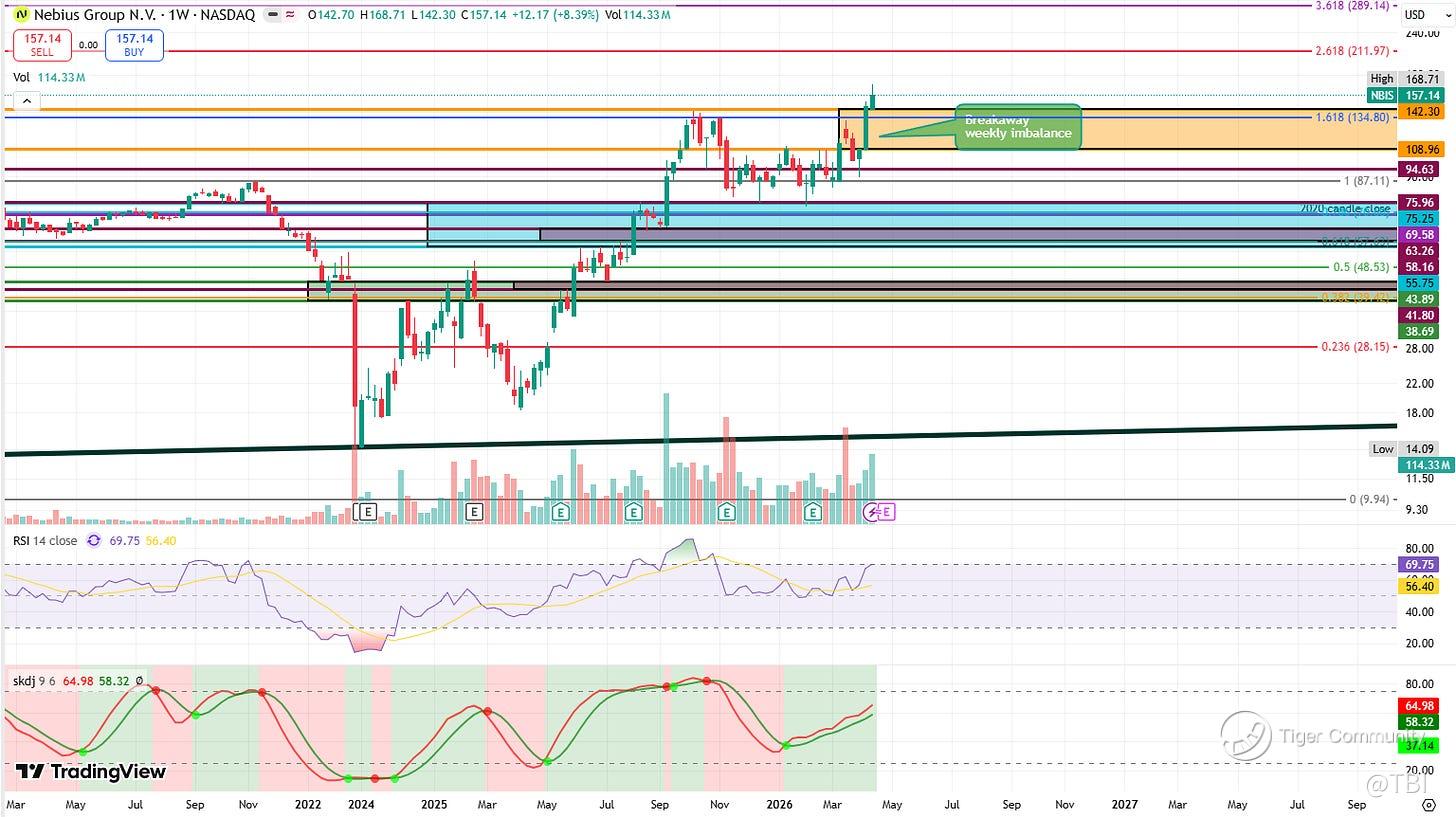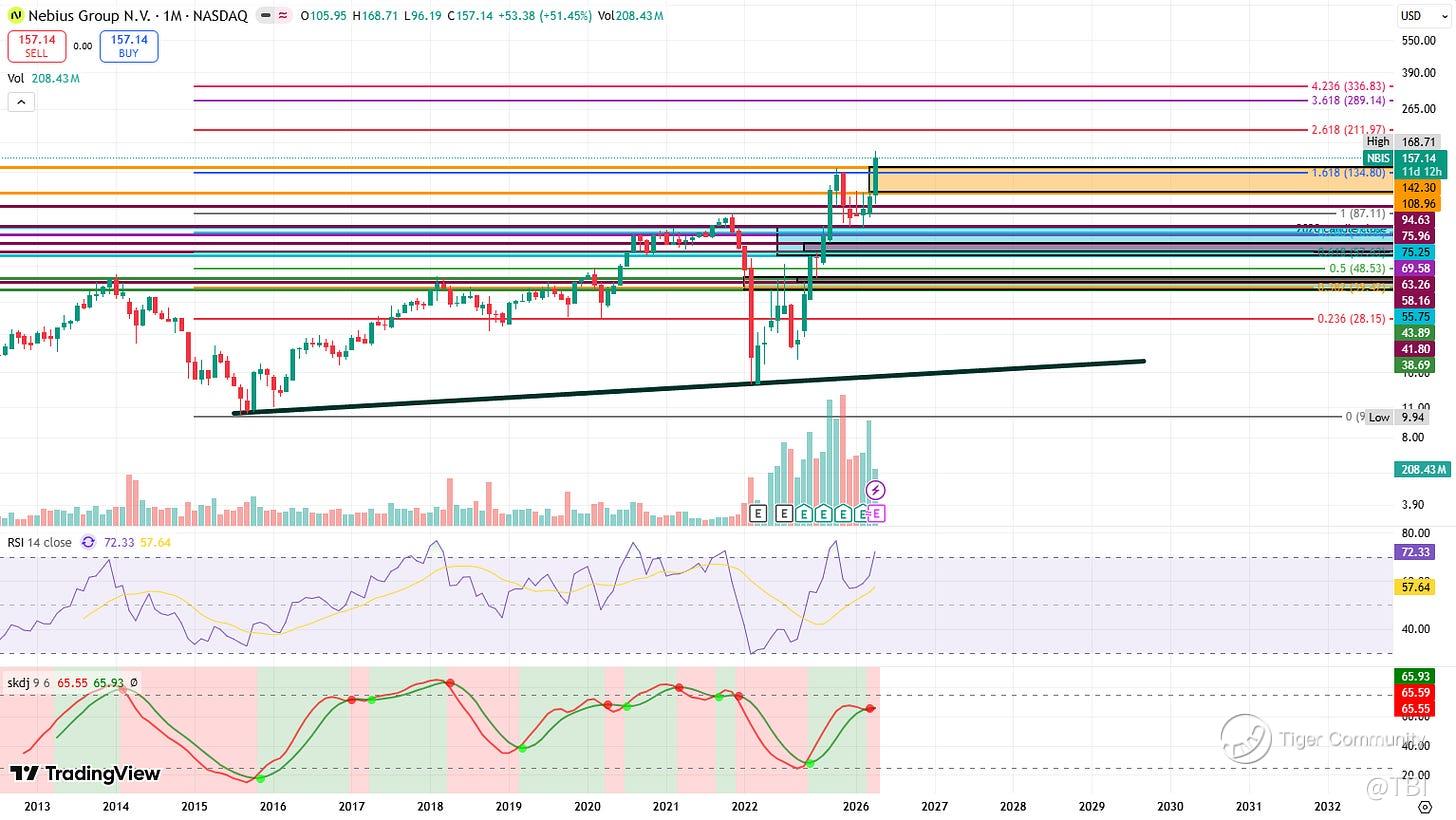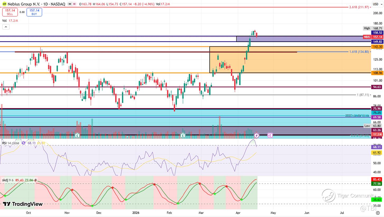 Overall Comments: On the whole, NBIS is in a steady uptrend. It broke out above the 1.618 Fib extension at 134.80 before forming a new ATH at 168.71.