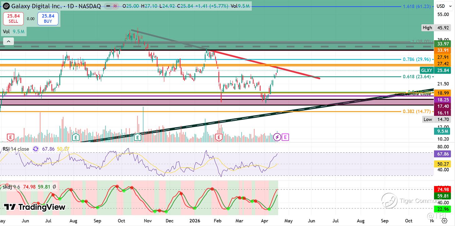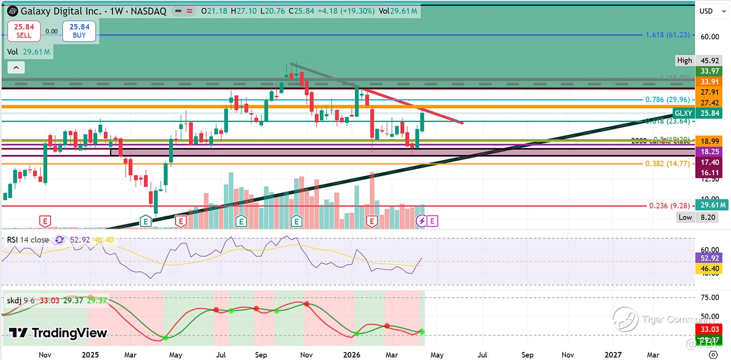 Outlook: If GLXY breaks above the red resistance trendline and the 27.42-27.91 weekly levels, then it can head towards the 29.96 Fib level next. Else, it likely retraces back into the dark green support trendline. If GLXY breaks above the 34-38 area, then it can see significant upside expansion towards the 1.618 Fib extension at 61.23. If GLXY breaks below the dark-green support trendline and the 14.77 Fib level, then it could see significant downside expansion.