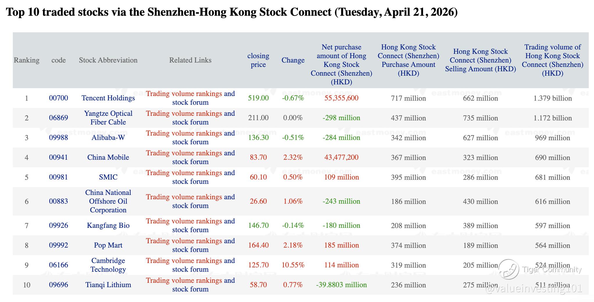 Top 10 SZ-HK Traded Stocks
