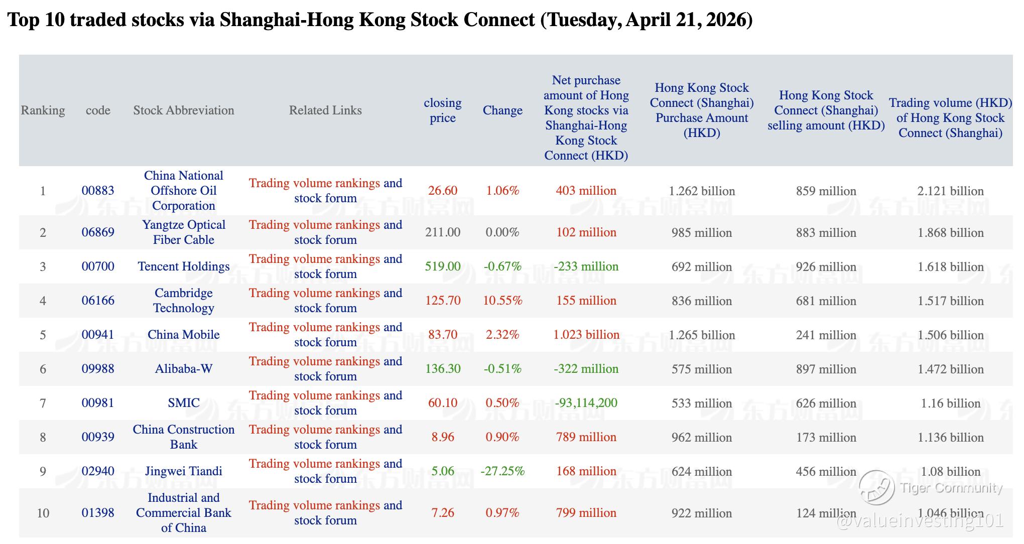 Top 10 SH-HK Traded Stocks