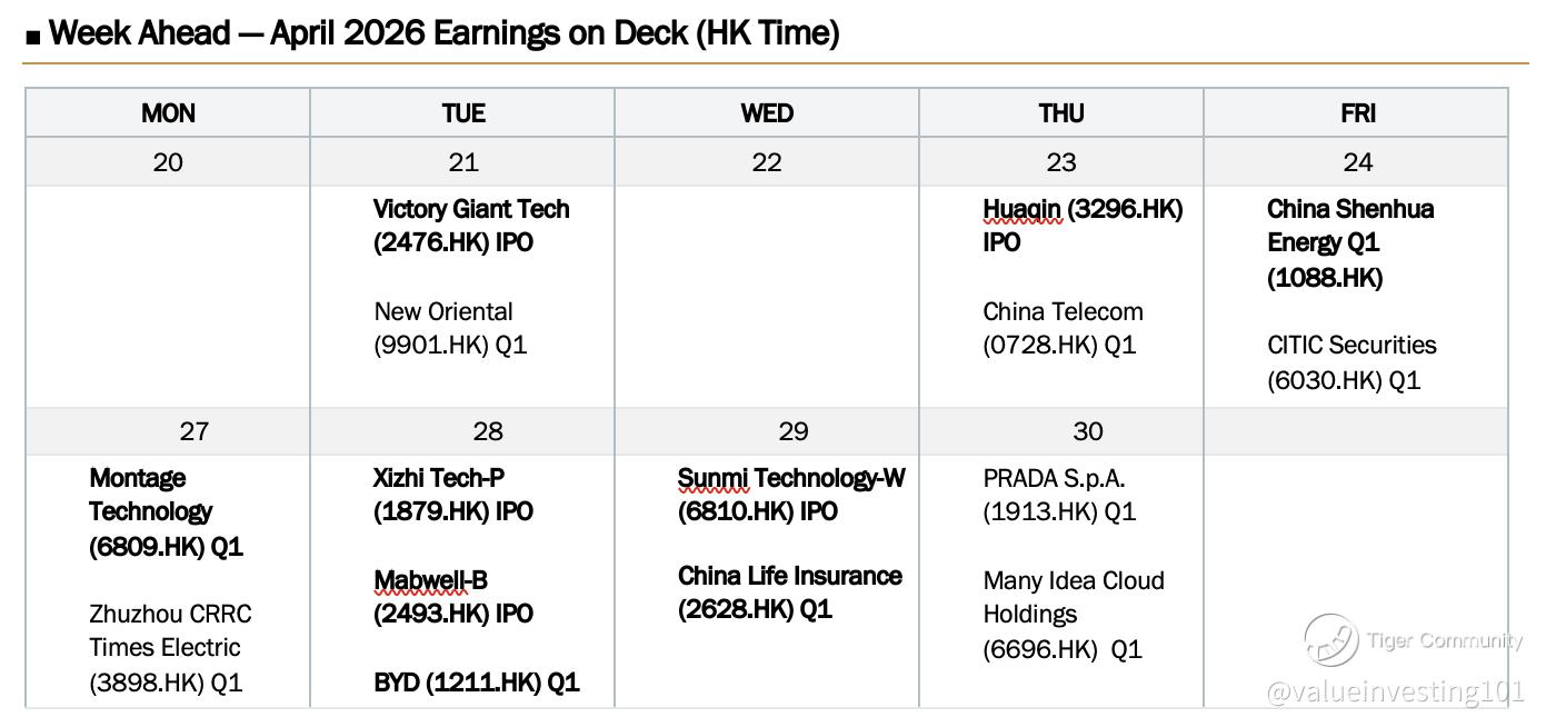 $CHINA SHENHUA(01088)$ and $CITIC SEC(06030)$ — Friday's energy + financials double-header will test whether commodity strength is translating to earnings beats and whether brokerages are capturing revived retail trading activity.