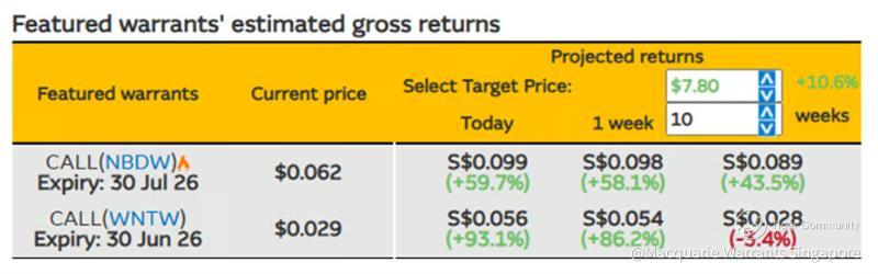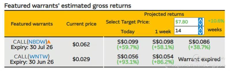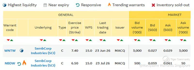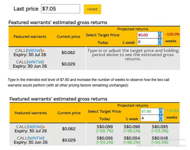 In this case, If SCI took 4 weeks to increase10.6 % from $7.05 to $7.80, the first call warrant $SembInd MBeCW260730(NBDW.SI)$ (https://warrants.com.sg/tools/livematrix/NBDW) will gain around 5.3 times more – 53.2% from SGD 0.062 to SGD 0.095, while the second call warrant $SembInd MBeCW260630(WNTW.SI)$ (https://warrants.com.sg/tools/livematrix/WNTW) will increase 6.5 times more i.e. +65.5% to SGD 0.048.