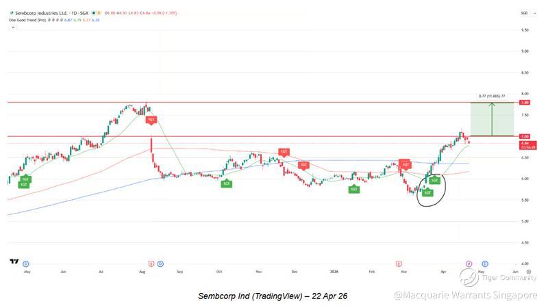 Sembcorp Industries has staged a strong recovery from its recent lows and is now testing the key $7.00 resistance level, a crucial zone that could determine its next directional move. Supported by consecutive 1GT Bullish signals and strengthening momentum, a successful breakout above this level could open the path toward the $7.80 highs. For traders looking to capitalize on this move with lower capital outlay, structured warrants offer a leveraged approach to participate in the upside potential, while keeping risk defined.
