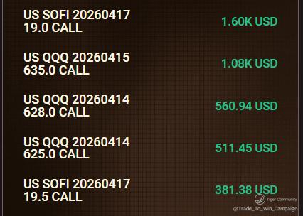 The top five trades were all short-term calls, focused on QQQ and SOFI with precise pre-rally entry—demonstrating clear conviction on specific assets and strike prices.