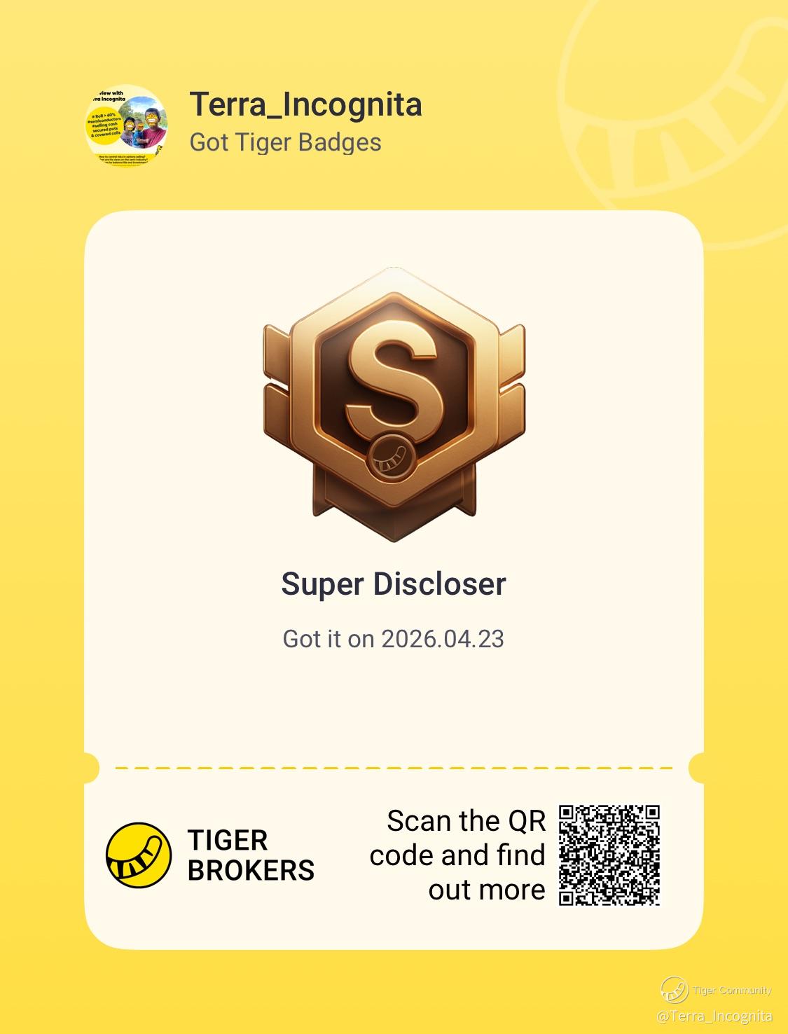 Super Discloser Badge. Seems like a new one. Happy to collect another trading badge. Thanks Tiger!