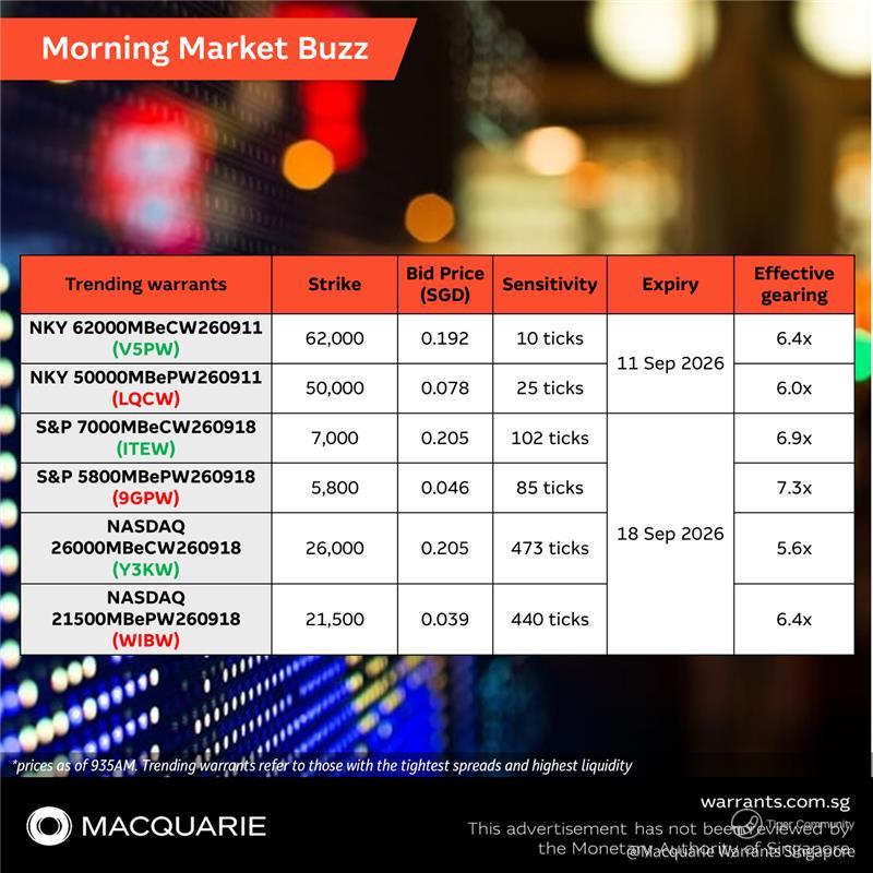 ⚙Investors keen to trade broad market moves in the Japan and US indices may consider the following trending $Nikkei 225 Index(N225.JP)$ , S&P500 and Nasdaq-100 call and put warrants that track their respective underlying futures which move during Singapore's trading hours from 9AM to 5PM