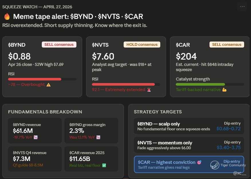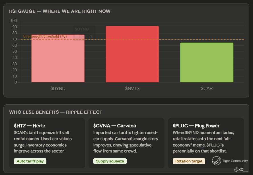 The meme tape is alive, but it's playing with a short clock. $CAR has the most durable legs. $BYND and $NVTS are pure adrenaline trades where timing is everything and overstaying your welcome is the #1 risk. Watch those RSI levels like a hawk β when the momentum crowd finally blinks, the exit door gets very small, very fast.