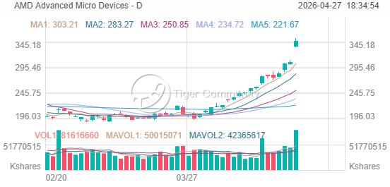 As of 2026-04-27, AMD closed at $347.81, surging +13.91% on the day. The stock hit its 52-week high of $352.99 during the session, closing just 1.5% below that peak.