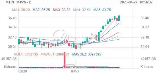 As of 2026-04-27, MTCH closed at $36.75, up +3.06% (+$1.09). It now sits 6.25% below its 52-week high of $39.20.