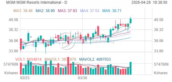 MGM closed at $40.55 on 2026-04-28, surging +2.55% (+$1.01). The stock is now trading at its 52-week high of $40.94, indicating strong bullish momentum.