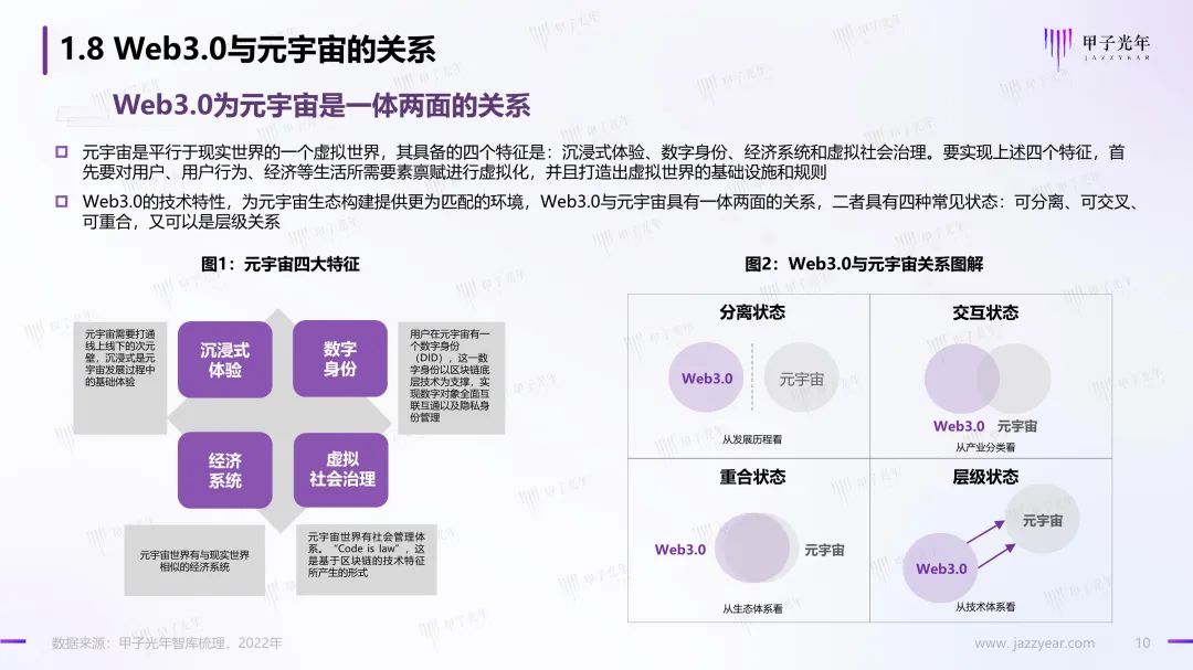 2.Web3.0的技術特性,爲元宇宙生態構建提供更爲匹配的環境,Web3.0與元宇宙具有一體兩面的關係,二者具有四種常見狀態:可分離、可交叉、可重合,又可以是層級關係