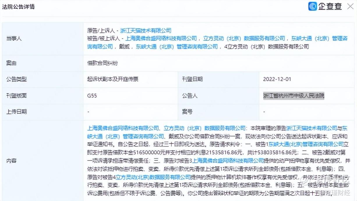 12月1日,消失在公衆視野許久的ofo因浙江天貓技術有限公司的一紙訴狀又重新被打到聚光燈下,因借款合同糾紛,將ofo小黃車的運營主體東峽大通(北京)管理諮詢有限公司以及創始人戴威起訴至浙江省杭州市中級人民法院,要求償還借款本金5.165億元及相應利息0.215億元,共計約5.38億元。