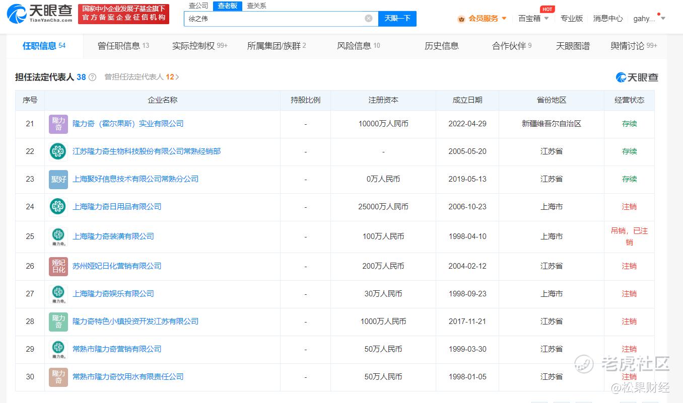 天眼查App顯示,江蘇隆力奇集團有限公司成立於1996年7月,法定代表人爲徐之偉,註冊資本3971.1萬人民幣,由徐之偉和劉增善共同持股。該公司對外投資的47家企業中,存續狀態的有25家,包括蘇州觀天下投資有限公司、江蘇隆創餐飲管理有限公司、南通優奇家政服務有限公司等,版圖涵蓋餐飲、房地產、家政等。此外,該公司的超百家分支機構已全部註銷或被吊銷。