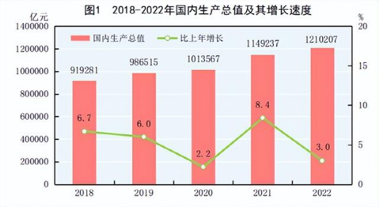 2月28日上午,國家統計局發佈2022年國民經濟和社會發展統計公報。初步覈算,全年國內生產總值1210207億元,比上年增長3.0%。其中,第一產業增加值88345億元,比上年增長4.1%;第二產業增加值483164億元,增長3.8%;第三產業增加值638698億元,增長2.3%。