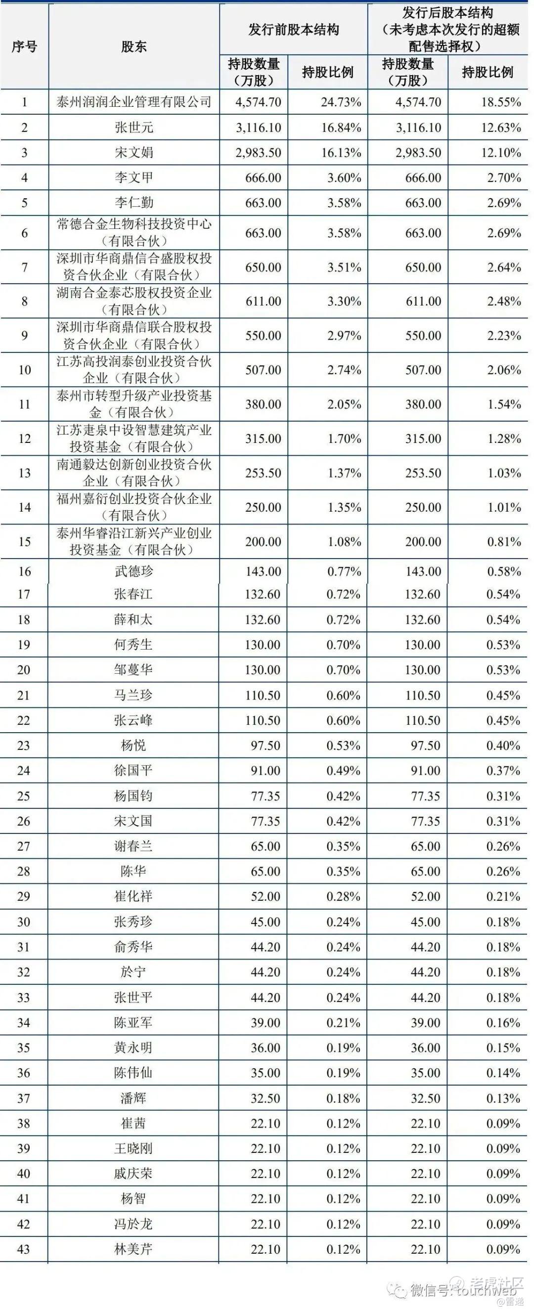 IPO後,泰州潤潤企業管理有限公司持股爲18.55%,張世元持股爲12.63%,宋文娟持股爲12.1%,李文甲持股爲2.7%,李仁勤持股爲2.69%,常德合金生物科技投資中心(有限合夥)持股爲2.69%,深圳市華商鼎信合盛股權投資合夥企業(有限合夥)持股爲2.64%,湖南合金泰芯股權投資企業(有限合夥)持股爲2.48%,深圳市華商鼎信聯合股權投資合夥企業(有限合夥)持股爲2.23%,江蘇高投潤泰創業投資合夥企業(有限合夥)持股爲2.06%,泰州市轉型升級產業投資基金(有限合夥)持股爲1.54%;