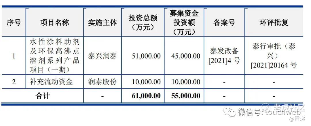 潤泰股份計劃募資5.5億元,其中,4.5億元用於水性塗料助劑及環保高沸點溶劑系列產品項目(一期),1億元用於補充流動資金。