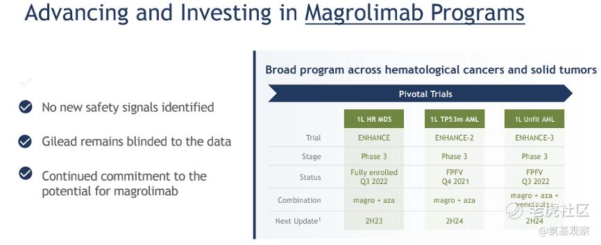 根據吉利德所說,Magrolimab當前進展良好。根據實時彙集的臨牀數據,獨立數據監察委員會給出的建議是,按照原計劃繼續推進臨牀工作。