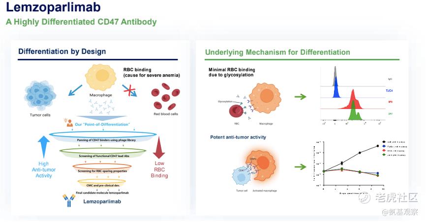 的確如此。利用獨有的技術平臺,天境生物通過反向操作方式篩選出的來佐利單抗,能與腫瘤表面CD47結合但與紅細胞親和力很低。