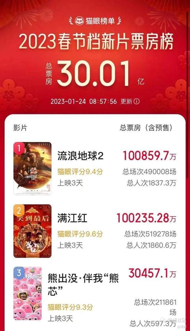 根據貓眼專業版數據,在大年初三上午8點57分,2023年春節檔總票房(含預售)突破30億。