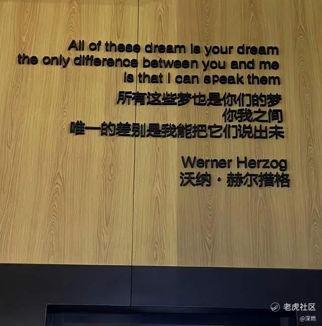 在一家影院的牆上,寫着一句知名導演、編劇沃納·赫爾措格的名言,“所有這些夢,也是你們的夢。你我之間,唯一的差別是我能把它們說出來”。