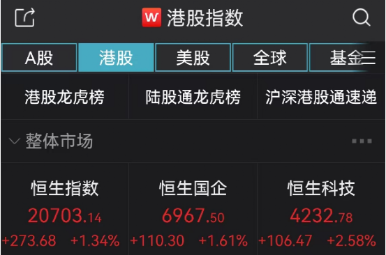 港股市場上,三大指數又是集體高開的一天:恆指高開1.34%,恆生國企指數漲1.61%,恆生科技指數漲2.58%。