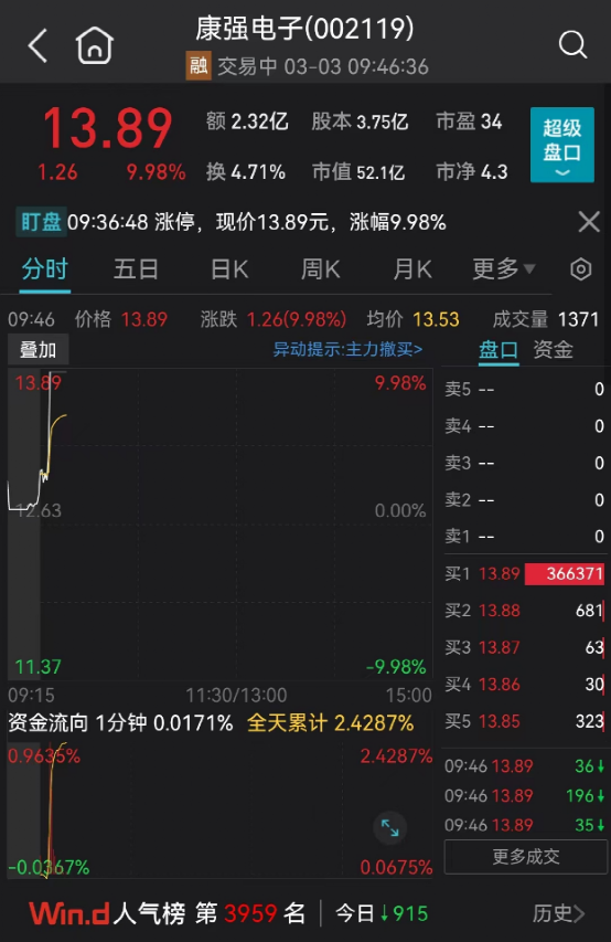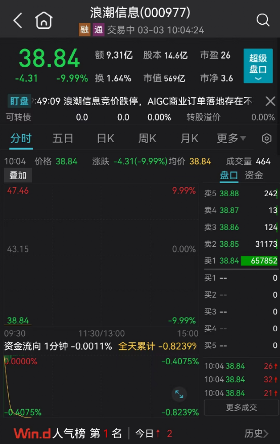 3月3日上午開盤,浪潮信息即走出一字跌停,股價跌至38.84元/股,市值569億元。截至發稿,浪潮科技賣1封單接近66萬手。