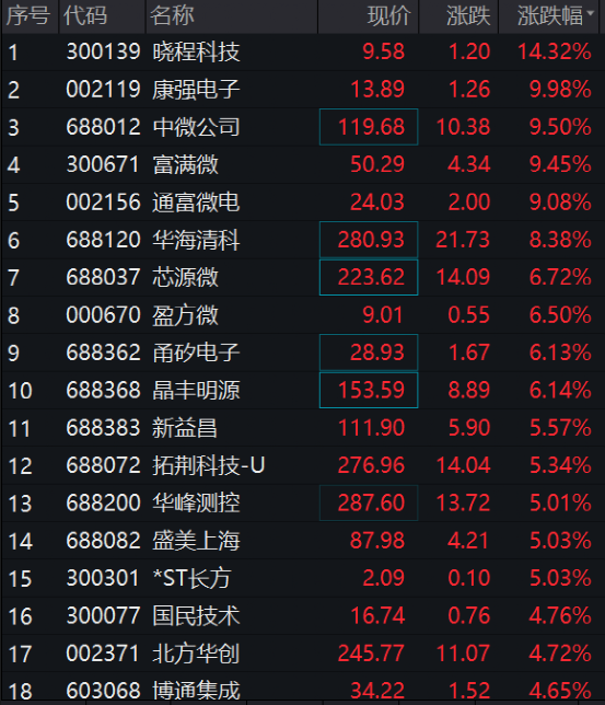 3月3日早盤,半導體指數全線衝高,相關概念股表現火熱。曉程科技盤中漲近19%,康強電子走出漲停板,中微公司、富滿微等衝擊漲停,通富微電、華海清科、芯源微等漲幅居前。