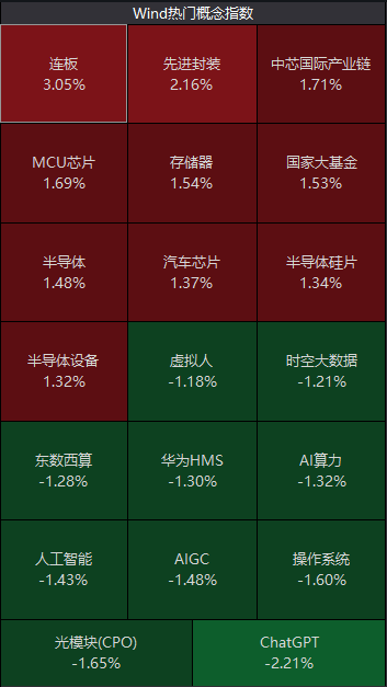 盤面上,芯片行業連迎利好提振信心,MCU、Chiplet、存儲器概念漲幅居前;計算機、通信回調,昨日火熱的時空大數據、ChatGPT題材領跌,浪潮信息一字跌停,中國電信開盤跌超2%。