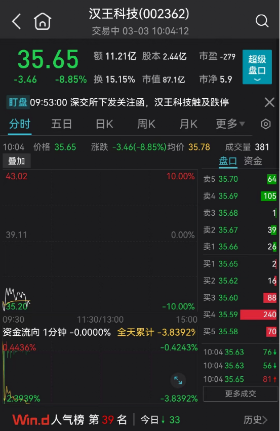 與此同時,漢王科技也在上午出現大跌,截至發稿股價來到35.65元,跌幅8.85%,盤中一度觸及跌停板。