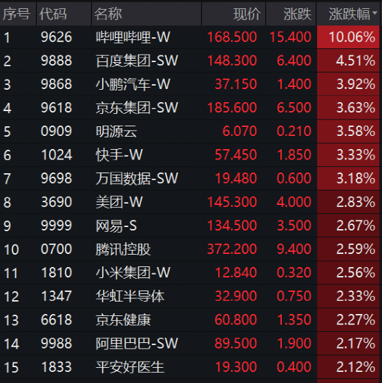 科技股普漲,百度漲4.5%領漲藍籌;嗶哩嗶哩績後漲超10%,小鵬汽車、京東漲近4%。