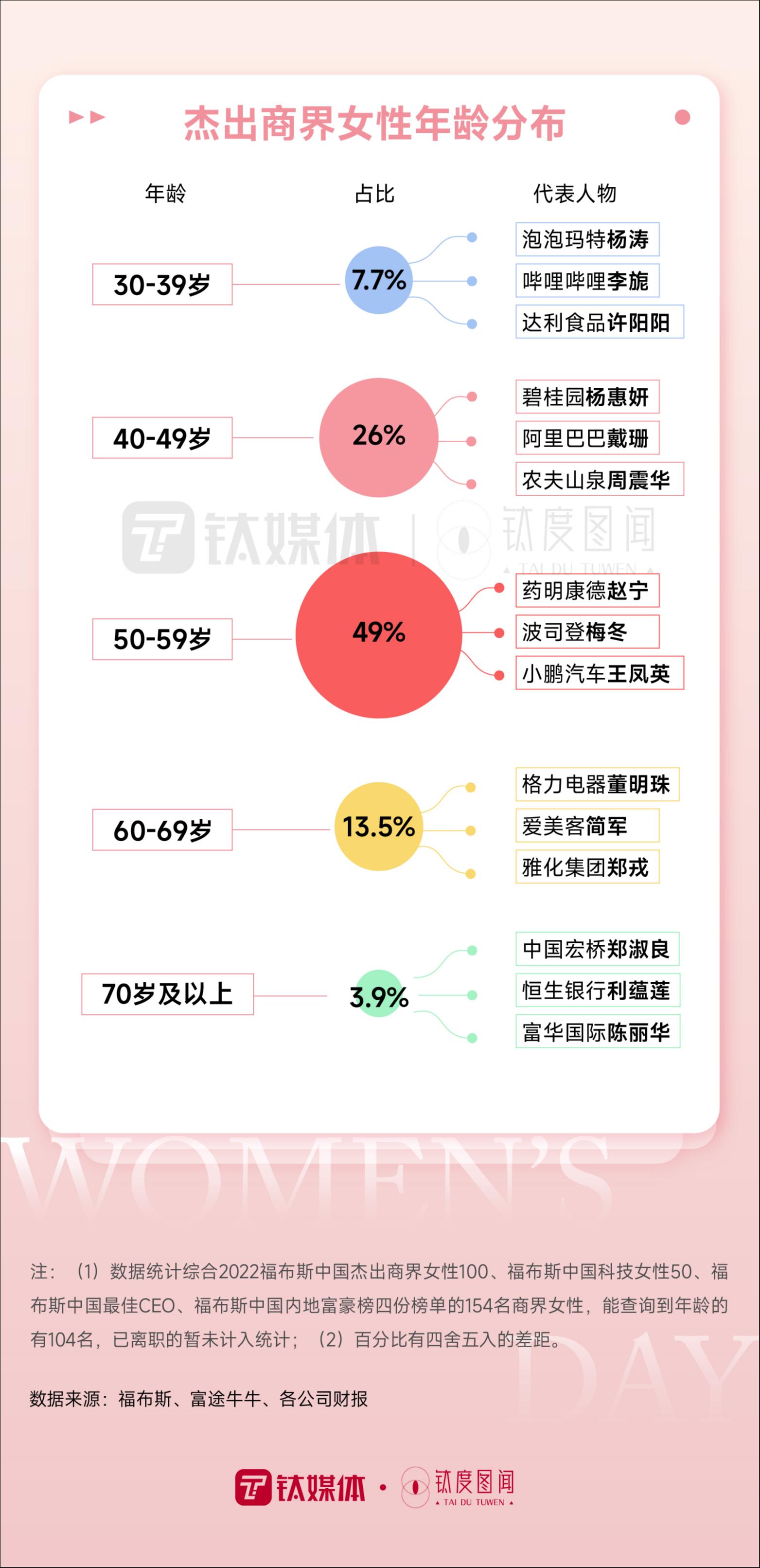 在披露具體出生日期的104名傑出商界女性中,她們的平均年齡爲53歲。其中,近半傑出商界女性年齡分佈在50-59歲,可以說這一年齡段是傑出商界女性發展的一段“黃金期”,代表人物如藥明康德趙寧、波司登梅冬、小鵬汽車王鳳英等。