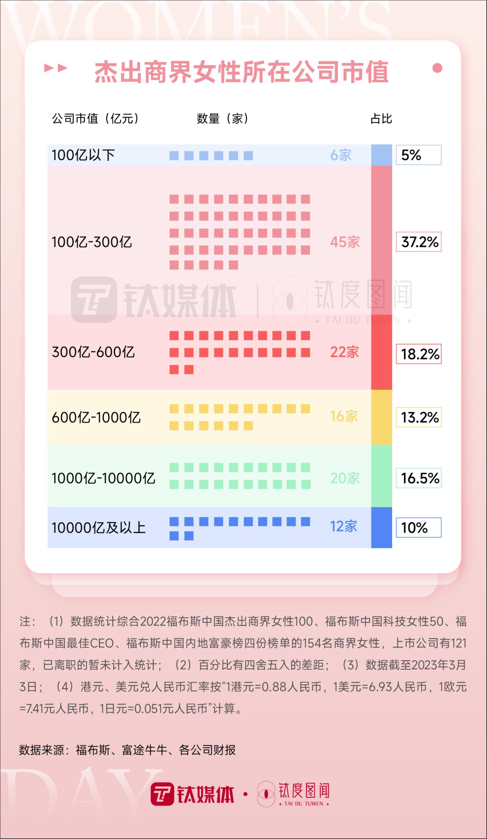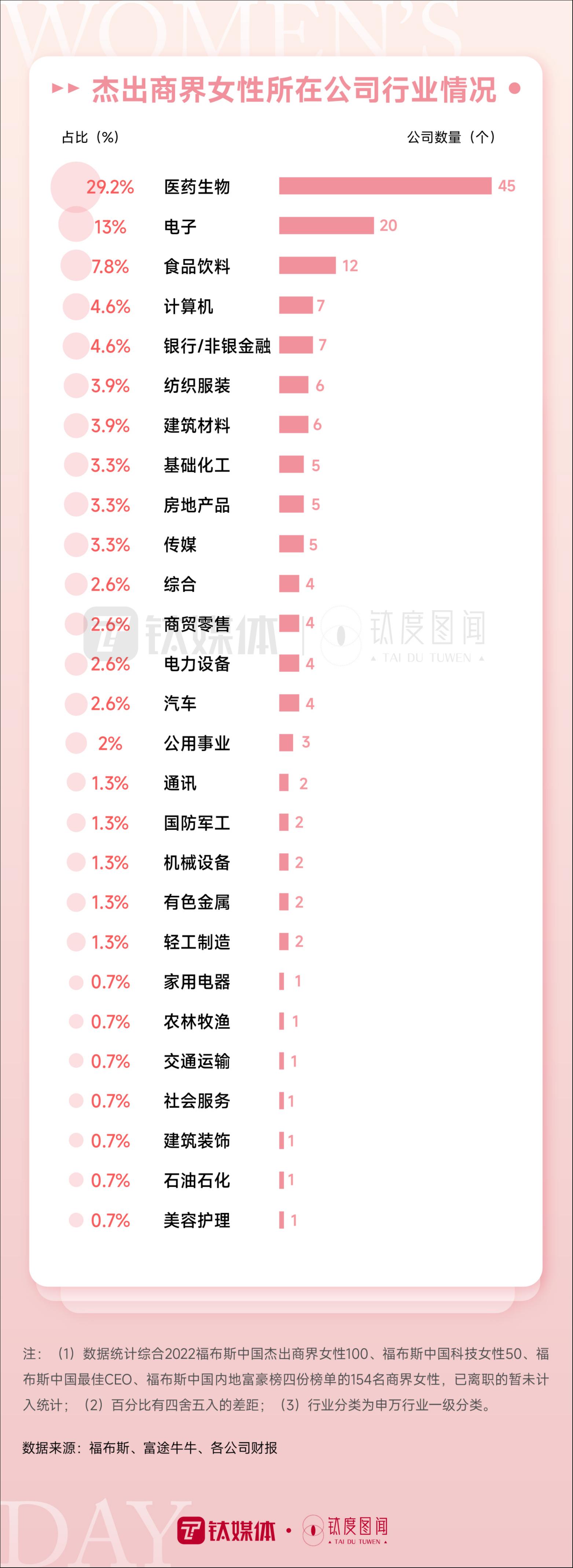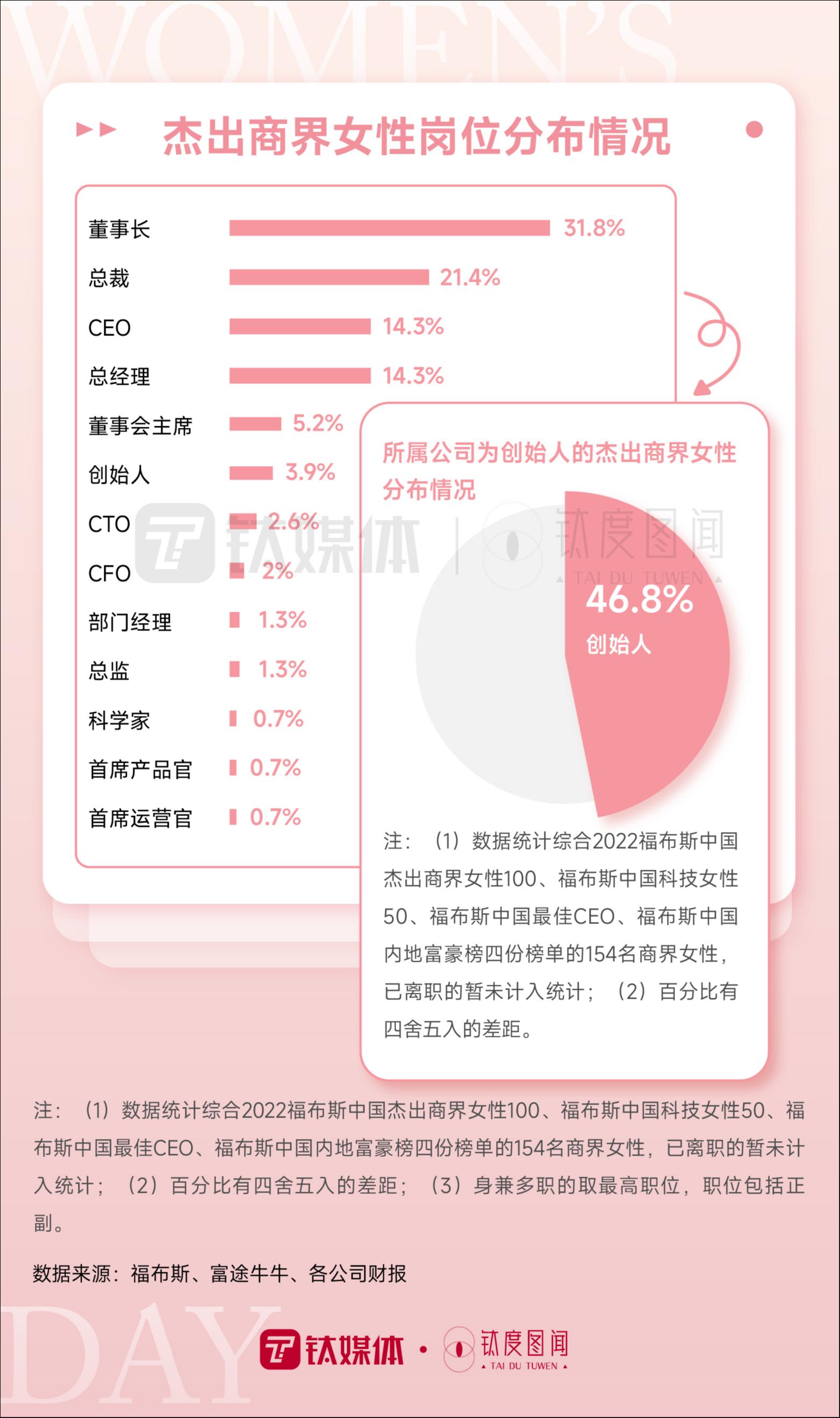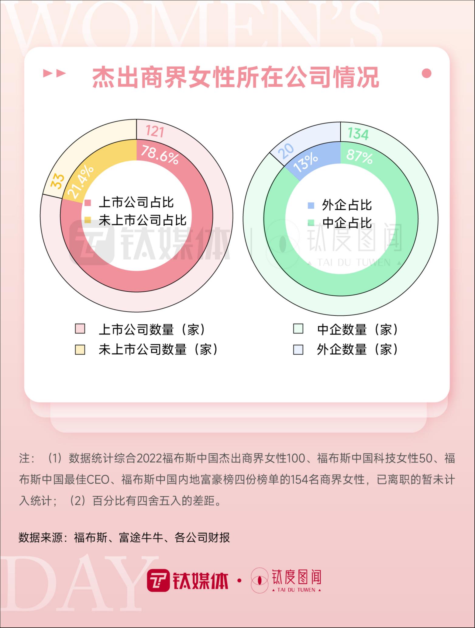 中國商界女性有多厲害?鈦媒體·鈦度圖聞統計了“2022福布斯中國傑出商界女性100”、“2022福布斯中國科技女性50”、“2022福布斯中國最佳CEO”、“2022福布斯中國內地富豪榜”四份榜單中的154名商界女性,“解密”傑出商界女性背後的數字密碼。