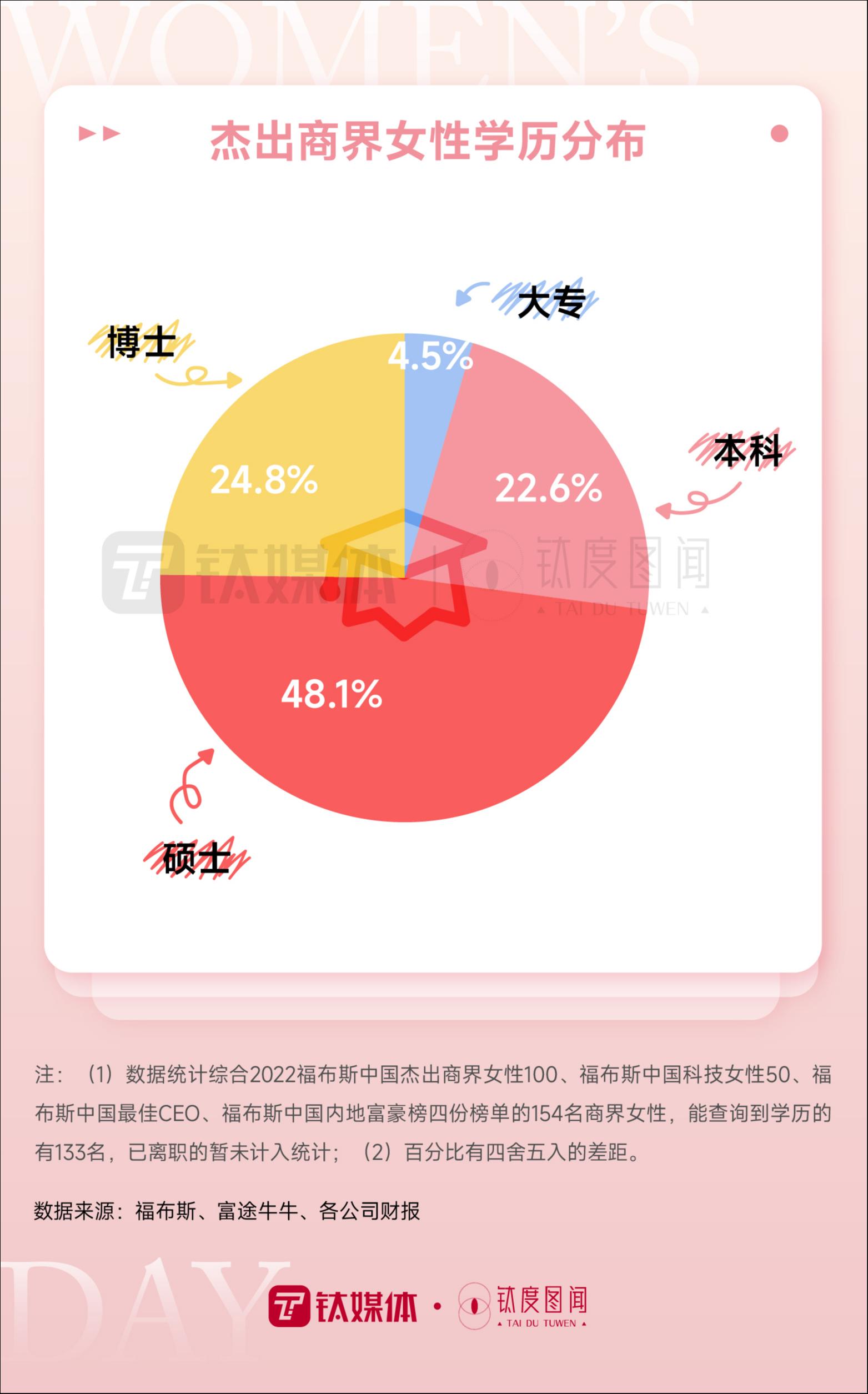 高學歷或許是傑出商界女性的財富密碼,她們大多擁有較高的學歷水平。在公佈學歷的133名傑出商界女性中,95%的女性接受過大學本科及以上的教育,72%的女性持有碩士及以上文憑,其中碩士研究生文憑的持有率最多,近50%,博士研究生排名次之,佔比達24.8%。其中,中銀證券的執行總裁寧敏是中國人民銀行博士後。
