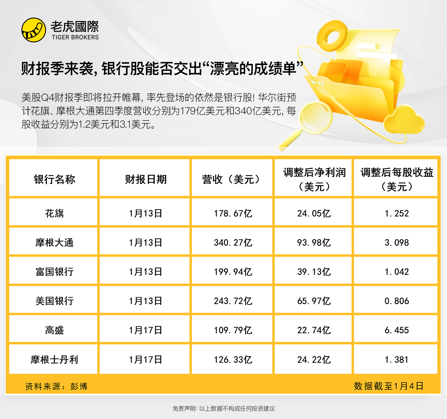 根據彭博一致預期,預計摩根大通將公佈每股收益爲3.098美元;預計花旗集團每股收益爲1.252美元;預計富國銀行每股收益將爲1.042美元;預計美國銀行每股收益爲0.806美元。
