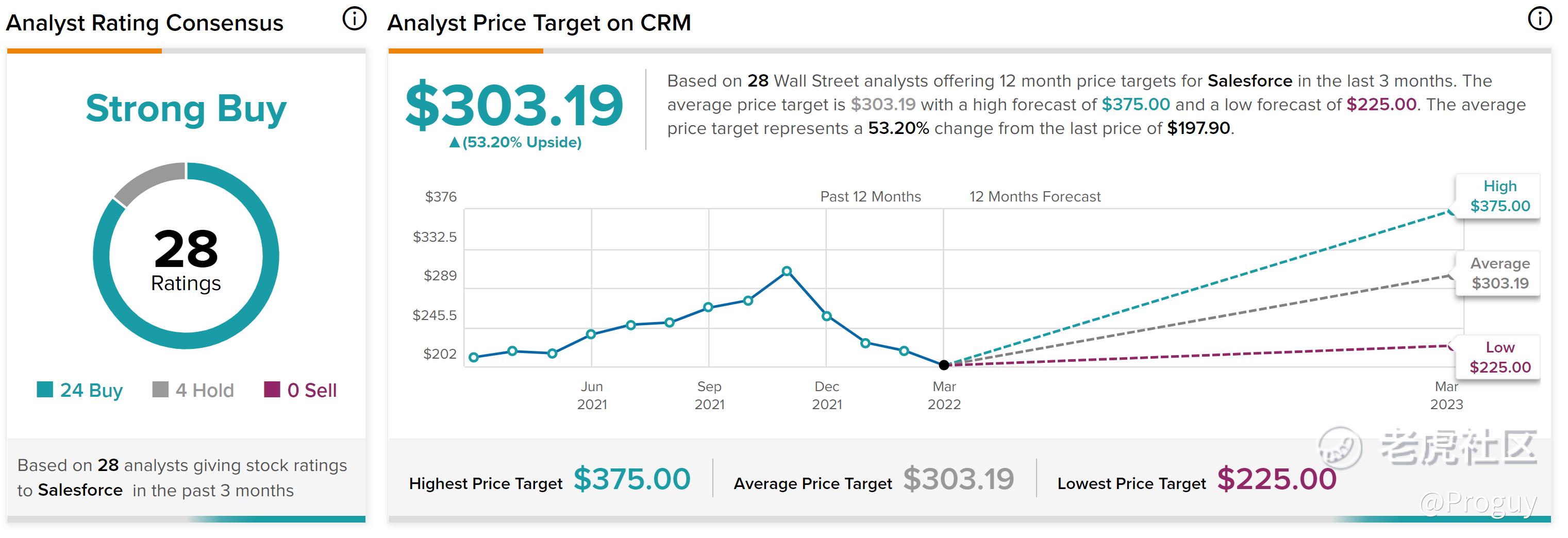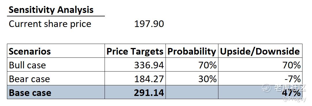 My bear case assumes that EBIT would not grow over the next 5 years in light of an economic recession. This scenario, while improbable should still be factored into the analysis. Keeping the remaining estimates constant, these projections gave CRM a price target of $184 which represents a 7% downside from what its shares are currently trading at. For my sensitivity analysis, I assigned a 70% and 30% probability to my bull and bear case respectively, giving CRM a weighted average price target of $291 and a 47% upside potential. This is slightly lower than the average price target of $303 assigned by analysts.