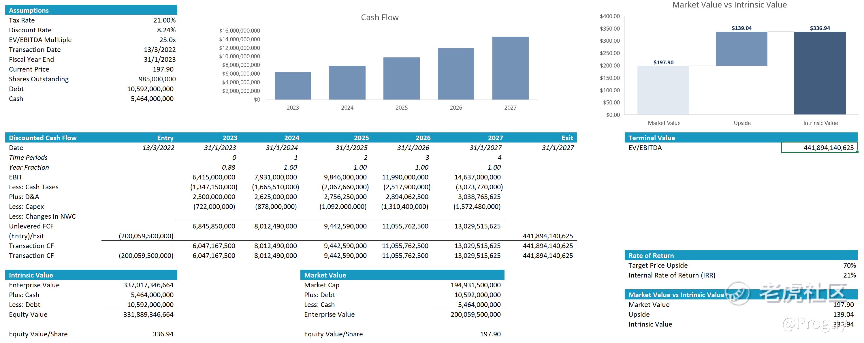 I then projected CRM's EBIT for the next 5 years, using a hybrid of analysts' estimates and historical revenue growth rates and operating margin. I forecasted depreciation and Capex to grow at 5% and 20% respectively, due to large investments in technology CRM is undertaking. Terminal value was calculated using am EV/EBITDA exit multiple of 25x, which is below CRM's average multiple of 28.68 due to lower growth expectations. CRM's terminal value was calculated to be $442 billion which amounts to a $337 equity value/per share when discounted to present value using the WACC. This represents a 70% upside to the price CRM is currently trading at ($197.20) and an IRR of 21%.