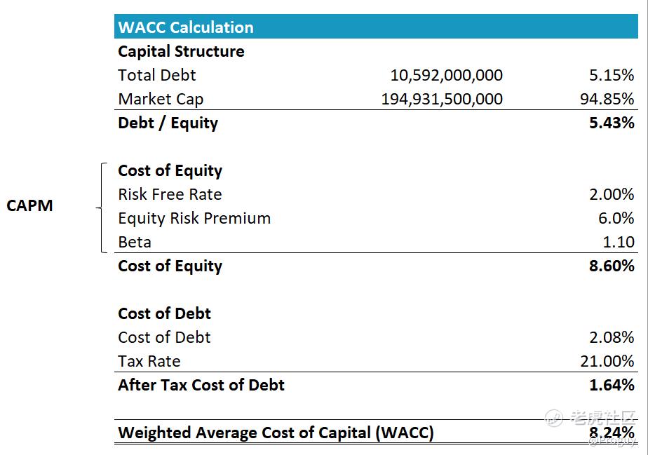 To derive the intrinsic value of CRM, I conducted a 5-Year DCF analysis on the unlevered Free Cash Flow (FCF) of the company. Firstly, I calculated the Weighted Average Cost of Capital (WACC) using the cost of equity derived from the CAPM formula and an after-tax cost of debt of 1.64%. The WACC for CRM was found to be 8.24%