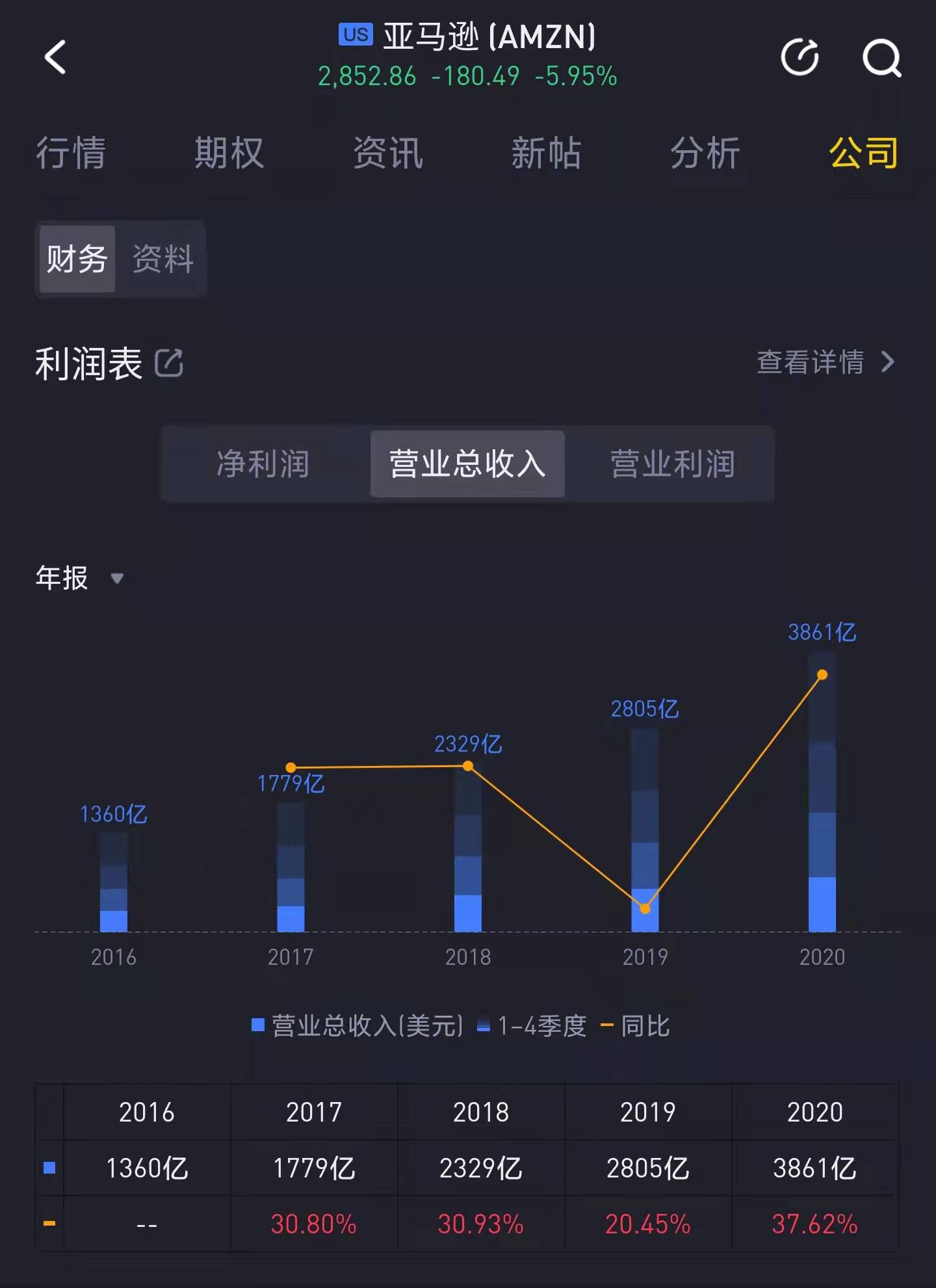③利潤上,從2016年到2020年,亞馬遜淨收入、營業總收入和營業利潤都在逐年穩步增長;簡單說,利潤非常穩定。
