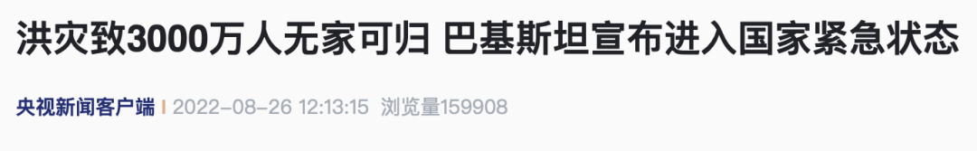 8月26日,據巴基斯坦國家災害局數據,六月中旬以來,巴基斯坦各地因強降雨和洪災造成的死亡人數上升至937人,3000萬人被迫無家可歸。繼俾路支省之後,信德省23個地區也成爲重災區。巴基斯坦政府25日宣佈進入國家緊急狀態。