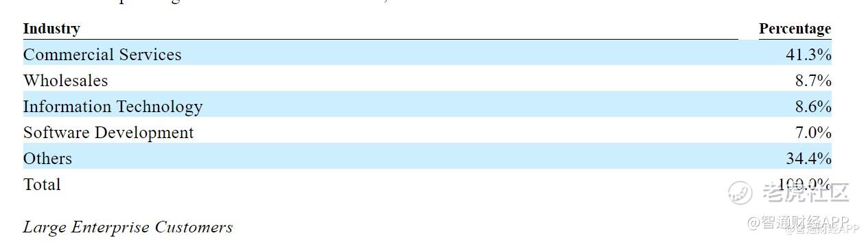 從客戶所處行業的類別來看,商業服務行業的佔比爲41.3%,批發、信息技術、軟件開發、其他行業的佔比分別爲8.7%、8.6%、7%、34%,客戶整體行業分佈相對分散。且從結構來看,2021年時,大型客戶佔比18.66%,中小企業佔比72.93%,初創客戶佔比17.58%。中小企業與初創客戶佔比高達90%。