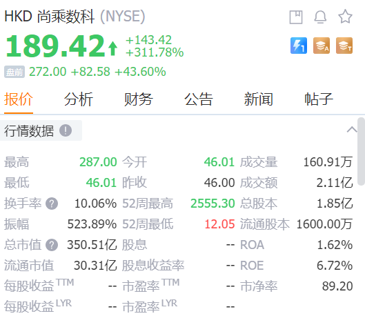 中概妖股再度“歸來”!$尚乘數科(HKD)$盤前漲超43%,該股上一交易日暴漲311%。
