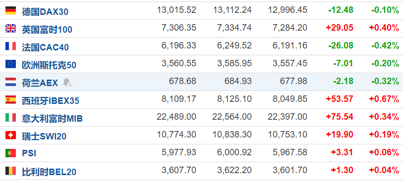 歐洲主要股指漲跌不一,截至發稿,德國DAX30指數跌0.10%,法國CAC40跌0.42%。