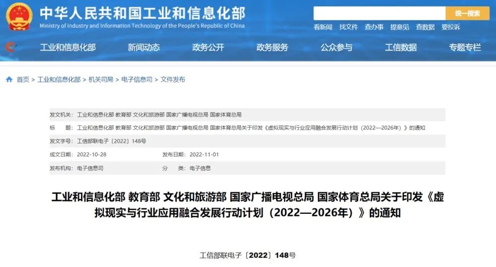 工信部11月1日公佈了《虛擬現實與行業應用融合發展行動計劃(2022—2026年)》,該行動計劃由工信部、教育部、文化和旅遊部、國家廣播電視總局、國家體育總局等五部門聯合發佈。