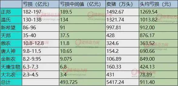 正邦虧損189.5億;溫氏虧損134億;新希望虧損91億;天邦虧損37.5億;傲農虧損11.8億;唐人神虧損10.65億;金新農虧損9.075億;天康虧損6.8億;大北農虧損3.4億。