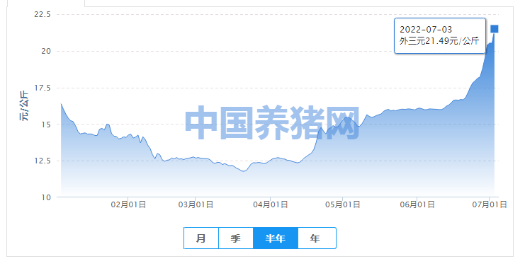 最新的全國市場外三元的豬肉價格已經到21.5元/公斤,過去一週的環比漲幅接近13%。