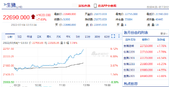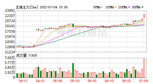 豬肉價格的快速上漲,也拉動生豬的期貨價格異動,7月4日午後,生豬主力合約觸及漲停。