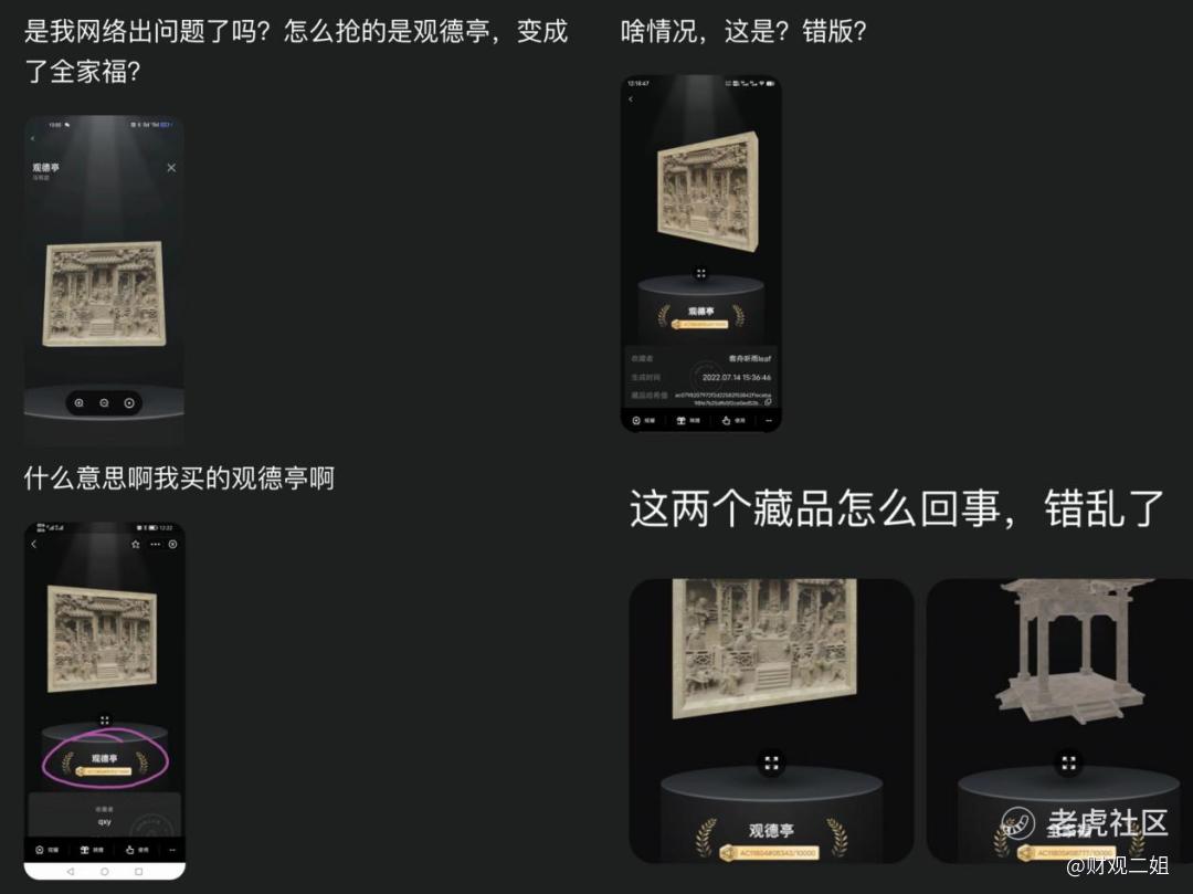 繼7月20日,騰訊旗下運行僅一年的數字藏品平臺“幻核”平臺被爆即將裁撤,引發業界一陣驚歎,二姐近日還發現,7月22日,阿里旗下的“鯨探”平臺,出現了“觀德亭”和“全家福”兩件數字藏品圖文不符的烏龍,引發不少藏家吐槽。