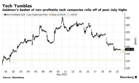 高盛一籃子非盈利科技公司股票於週一下跌2.6%,目前處於8月2日以來的最低水平。當投資者預計利率上升和通脹會侵蝕未來收益時,那些基於未來利潤預期而估值極高的科技公司股價就會面臨下跌風險。