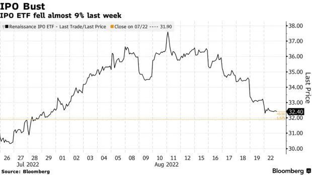 美聯儲激進的貨幣政策對新上市公司的打擊尤爲嚴重。Renaissance IPO ETF (IPO)上週下跌8.9%,創5月份以來最大單週跌幅。自今年年初以來,該基金已經累計下跌了約44%。