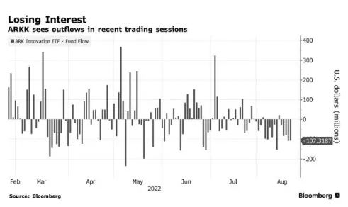 木頭姐的ARKK已連續五個交易日出現資金流出,包括過去12個交易日中的11個交易日。今年迄今爲止,除了6月份,這隻ETF每個月都有資金流入,儘管自2022年開始以來,它的市值已經累計下跌近一半,該基金於本週一大跌2.4%。